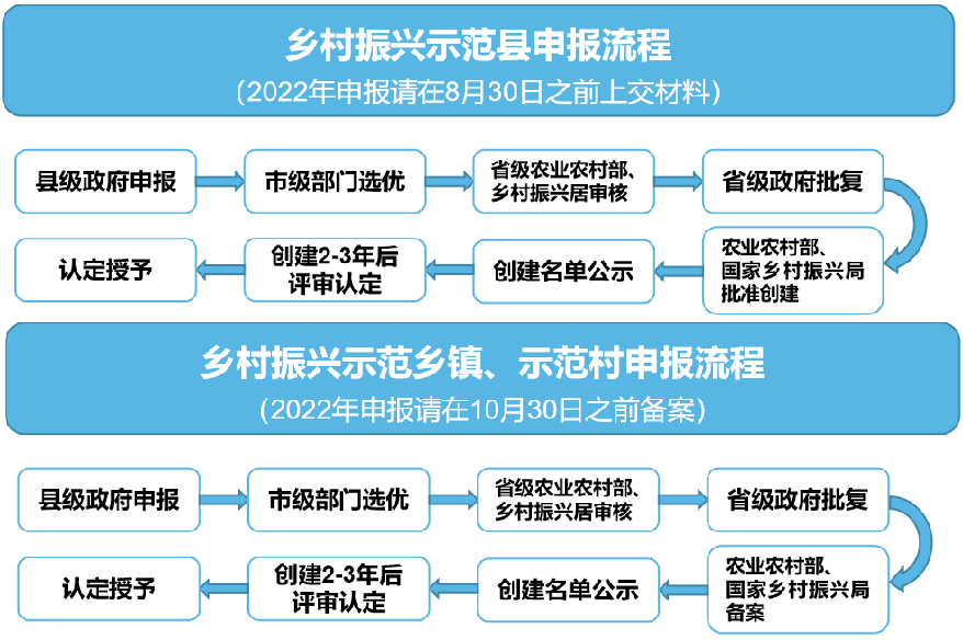 2022年7月20日,農業農村部、國家鄉村振興局印發《關于開展2022年“百縣千鄉萬村”鄉村振興示范創建的通知》,明確將分級組織創建100個左右國家鄉村振興示范縣,1000個左右鄉村振興示范鄉鎮、10000個左右鄉村振興示范村。